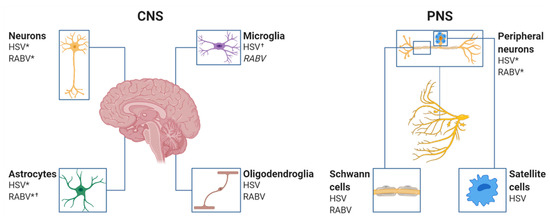 Taken together, RABV field strains and HSV-1 productively infect neurons and astrocytes in vivo, while microglia and oligodendroglia are less or not at all susceptible to infection. Infection of SCs has been observed for field RABV and HSV infection, but the role of infected SCs in viral encephalitis remains poorly understood. On the one hand, the strain specificity of the virus and, on the other hand, receptor expression and cell-specific immune responses of the cellular host determine cellular tropism and infection outcome. Although it is suggested that RABV and HSV bear a neuron-specific tropism, cellular tropism might be much wider than initially believed (Figure 3).