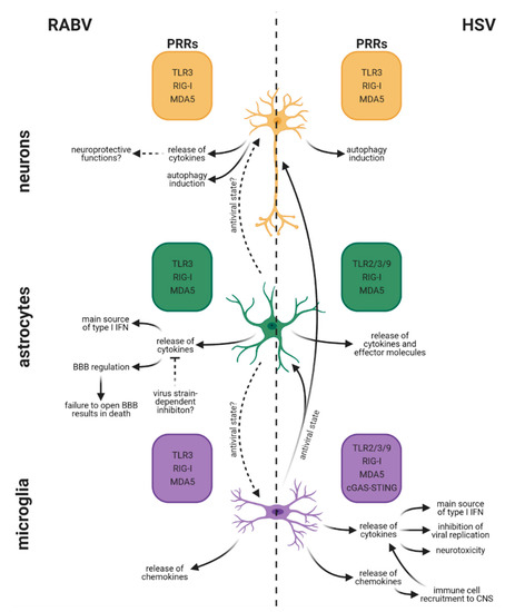 Hypothesis of cell-specific innate immune responses of CNS cell types upon RABV and HSV infection. Neurons (yellow), astrocytes (green), and microglia (purple) are productively or nonproductively infected by HSV and RABV (Figure 3). Infection is sensed via a cell-specific set of PRRs, which trigger downstream signaling pathways and lead to the induction of an innate immune response [239]. Whereas certain PRRs are associated with RABV and HSV infection, neurons do not exhibit evident immune responses upon viral infection. It is suggested that neurons lack robust innate immune signaling to minimize harm and rather require autophagy to restrict RABV [247] and HSV [246,248] replication. In contrast, astrocytes and microglia respond to RABV and HSV infection via the production of cytokines and chemokines [109,144,193,249,250,251,252,253]. While for HSV, microglia are the main source of type I IFN in the CNS and result in pronounced immune cell infiltration [108], astrocytes comprise the primary type I IFN producers for RABV [109]. Dashed arrows indicate putative or suggested effects.