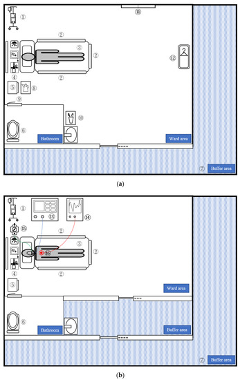 Illustration of COVID-19 isolation wards (a) and ICUs (b) indicating the sampling areas. The contamination rate of each area is as follows: Common area: ① IV stand and IV pump (rate = 0/11, 0%); ② bed rail (rate = 4/52, 7.7%); ③ mattress (rate = 0/11, 0%); ④ wall equipment: call bell, oxygen flowmeter, light switch (rate = 0/17, 0%); ⑤ bedside table (rate = 3/25, 12%) ⑥ toilet: toilet seat and flush button (rate = 2/11, 18.2%); ⑦ buffer area (rate = 0/50, 0%); Exclusive ward: ⑧ kettle (rate = 2/12, 16.7%); ⑨ door handle (rate = 0/12, 0%); ⑩ washbasin including toothbrush and mouth cup (rate = 5/11, 45.5%) ⑪ windowsill (rate = 1/5, 20%); ⑫ wardrobe (rate = 0/5, 0%); Exclusive ICU: ⑬ ventilator (rate = 0/11, 0%); ⑭ monitor (rate = 0/11, 0%); ⑮ suction switch (rate = 1/11, 9.1%); and ⑯ EKG lead (rate = 1/12, 8.3%). COVID-19, coronavirus disease-19; ICU: intensive care unit.