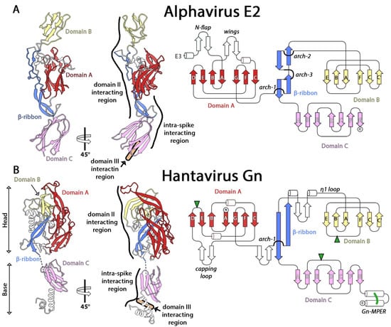 Figure 1. The structure of the accompanying proteins of alphaviruses (E2, panel A) and hantaviruses (Gn, panel B). The left and central panels show a cartoon representation of E2 (PDB: 6JO8 [30]) and Gn (PDB: 6ZJM [16]) in side view. Domains A, B, C, and the β-ribbon are indicated and colored in red, yellow, pink, and blue, respectively. The right panels show topology diagrams of E2 (top) and Gn (bottom) with the domains colored as mentioned previously.