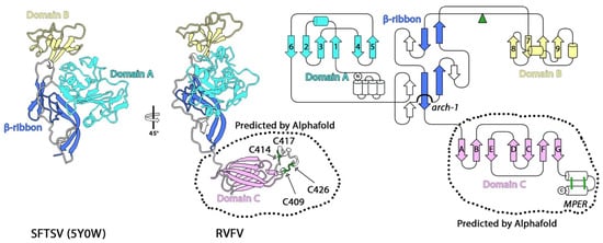 Figure 2. The structure of the accompanying protein Gn of several families of phenuiviruses (phlebovirus and bandavirus). The left panels show a cartoon representation of the models derived from x-ray crystallography from SFTSV (PDB: 5Y0W [53]) in side view. Domains A, B, C, and the β-ribbon are indicated and colored in cyan, yellow, pink, and blue, respectively. The central panels show the structure of the ectodomains of Gn from RVFV obtained using AlphaFold [22]. Regions not present in the experimental crystallographic models are marked with a dashed outline. Disulfide bridges in the MPER region are represented as green sticks. The right panel shows a topology diagram based on the AlphaFold model colored by domains as indicated, the disulfide bonds in the MPER region are shown as green lines, and the location of the putative N-glycosylation site with green arrowheads. The alphafold model of RVFV is available as a Supplementary Items in this manuscript.