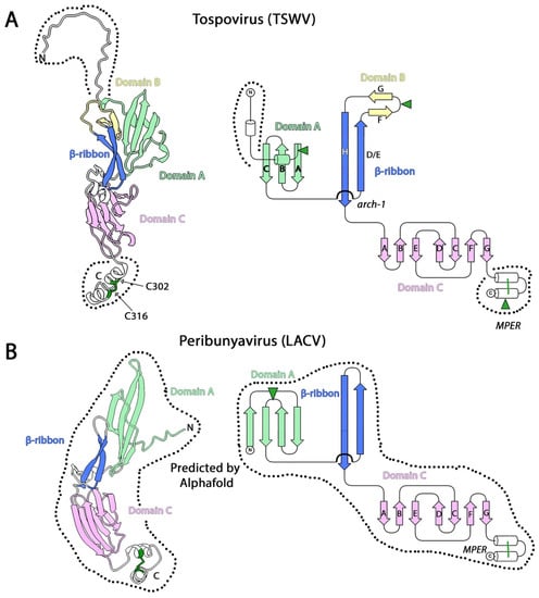 Figure 3. The structure of the tospovirus (A) and peribunyavirus (B) class II AP. Shown are the AlphaFold prediction of the tospovirus TSWV Gn (R9RUV9, panel A) and LACV Gn (Q8JPR1, panel B) colored according to domains as indicated. The left panels show a cartoon representation of the model, and the right panels a topology diagram. In A, the dashed outline indicates the regions not present in the X-ray crystallography model of TSWV Gn (PDB: 6YA2 [56]). To date, there is no experimental structure for Gn of any peribunyavirus, and only the prediction by AlphaFold is displayed in B. The disulfide bond in the MPER regions is indicated with green lines, and the location of the putative N-glycosylation site with green arrowheads. These models are available as a Supplementary Items in this manuscript.
