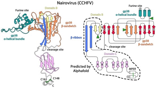 Figure 4. Structure of the nairovirus class II AP. The left panel is a cartoon representation of the CCHFV gp38/Gn complex obtained using AlphaFold. The portion corresponding to gp38 is identical to its x-ray structure (PDB: 6VKF [68]), and is colored according to domains, the N-terminal α-helical bundle in teal, and the C-terminal β-sandwich in orange. The portion corresponding to Gn, for which there is no experimental data, is colored according to domains as indicated. In the right panel, the topology diagram is colored in the same way, and has a dotted outline for the region for which no experimental structure is available. The disulfide bond in the predicted MPER region is depicted and labelled, with the corresponding cysteines labelled in the right panel. As the mucin-like domain (MLD) is intrinsically disordered, it is not included in the diagram. The putative N-glycosylation sites are indicated with green arrowheads, the putative disulfide bond in the MPER (labelled in the right panel) with green sticks (left panel) or a green line (right panel). This model is available as a Supplementary Items in this manuscript.