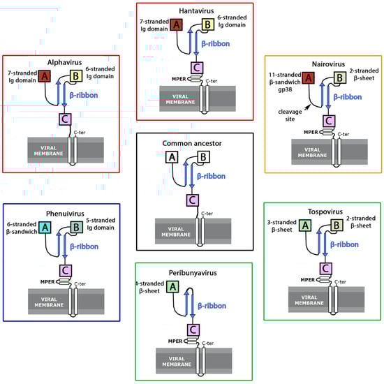 We show that, like the MFPs, the class II APs of the Togaviridae family, as well as several families of the Bunyavirales order of positive-sense and negative-sense single-stranded viruses, respectively, share common structural features: a long β-ribbon immediately followed by an “s-type” domain of the immunoglobulin superfamily (IgSF) [24]. This structural motif has been conserved during evolution despite a much stronger pressure for antigenic drift, or even antigenic shift [25], than that experienced by the actual MFP, which is less exposed on the particles. Overall, our analysis reveals that the accompanying protein in the canonical class II viruses appears to have been present in an ancestral AP/MFP heterodimer that has evolved significantly to constitute the class-II membrane fusion machinery of extant viruses.