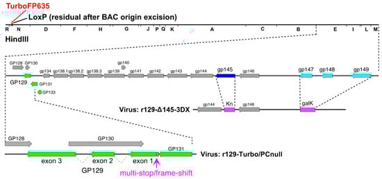 In virus r129-Turbo/3DX/Δ145 (designated as vaccine 3DX/Δ145) two deletion/substitutions removed gp147-149 and gp145 (Figure 1). Deletion of gp147-149 was achieved by transforming E. coli strain SW102 cells containing BAC N13R10r129-TurboFP635 [52] with a PCR product generated by amplifying plasmid pgalK DNA using oligonucleotides 3DX-GALK-FW (5’-GTCGCGATTCAAGTGGCTTTGGAGTAGAGTCGTATCTGAAGCGAATGCCGAACGACTCACTATAGGGCGAATTGG-3′) and 3DX-GALK-RV (5’-CAACGACTTTACGCCGCTGCGCATACTCCAACGCGAGGAACCCAAAAGTTGTGCTATGACCATGATTACGCCAAGC-3′), followed by colony selection on gal-positive selection plates, and verification of a clone in which gp147-149 sequences were replaced by galK sequences using PCR and restriction analysis. Deletion of gp145 was subsequently achieved by replacing gp145 with a kanamycin resistance (Kn) cassette as described previously [50].