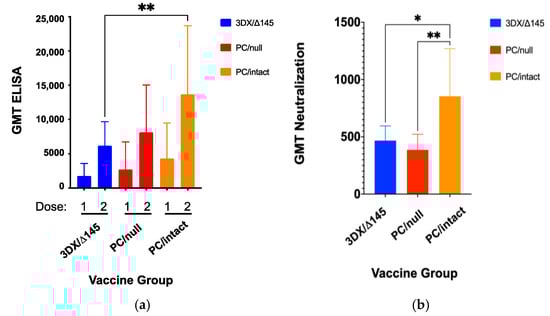 - Dams in the PC/intact vaccine group demonstrated higher mean virus-neutralizing antibody titers, assessed on fibroblast cells, compared to either the PC/null or the 3DX/Δ145 groups.