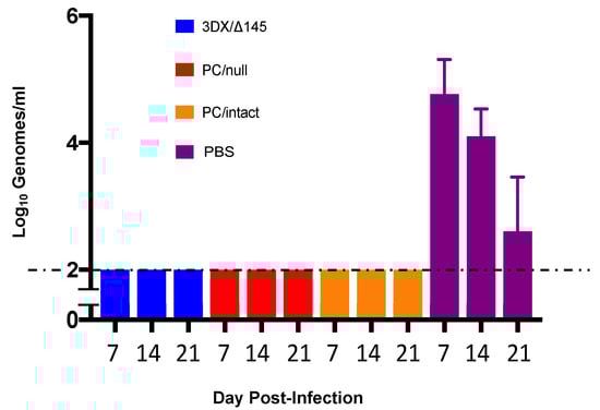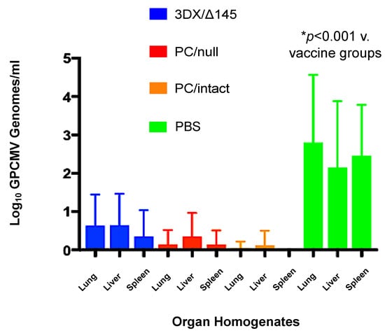 Effect of vaccination on pup viral load. Blue bars, 145/3DX vaccine; red bars, PC/null vaccine; orange bars, PC/intact vaccine; green bars, sham (PBS) vaccine. Viral loads in pup visceral organs (lung, liver, spleen) were determined by qPCR (note only 38 pups were available from the 3DX/Δ145 group). Data shown are log10 viral loads (genomes/mg) ± SD. All vaccines conferred reduced viral loads in pup organs compared to PBS (mock) vaccinated controls (p < 0.001).