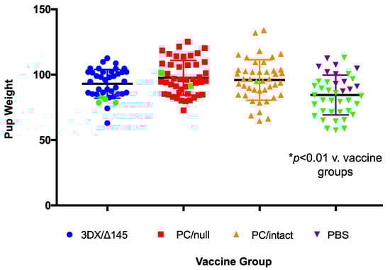All vaccines had a positive impact on pregnancy outcome following SG-GPCMV challenge during pregnancy, compared to sham-immunized (PBS) controls (Table 1). Pup mortality in PBS controls was 73% (29/40), and decreased to 2.3% (1/44), 4.3% (2/46), or 10% (4/40) in the PC/intact-, PC/null-, or 3DX/Δ145-vaccinated groups, respectively (p < 0.001). There were no significant differences in the duration of pregnancy following the SG-GPCMV challenge in vaccine and control groups, but notably, the newborn pup weights (Figure 4 and Table 1) were significantly lower in pups born to sham-immunized control dams (84.5 ± 2.4 g) compared to the pups born to dams in the PC/intact (96 ± 2.3 g), PC/null (97.6 ± 1.9 g), and 3DX/Δ145 (93 ± 1.7) groups (p < 0.01).