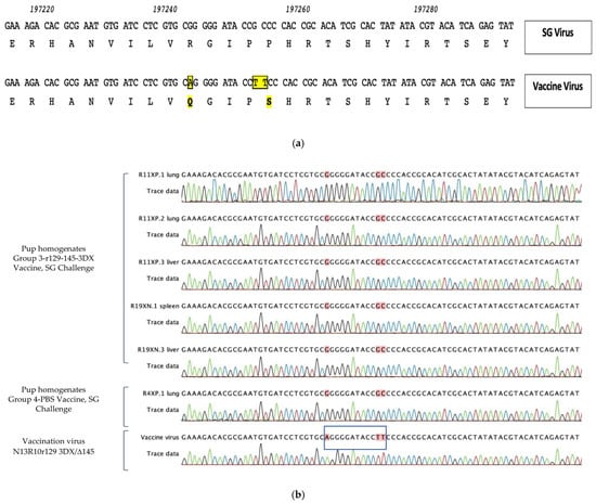 For tissue samples from congenitally infected pups, sequence analysis was performed to evaluate whether congenital infection was due to SG-GPCMV challenge virus, or caused by the vaccination virus. DNA purified as described in Section 2.6 was amplified by conventional PCR, using primers GP130-FW (5′-GGCGTCGGTATCATTACGGT-3′) and GP130-RV (5′-TCTTTGACGACCCGTGTTGT-3′). Previously, we noted that the original r129 virus that rescued the frame-shift mutation in GP129 in N13R10 (and which was the parent construct for the vaccines described in this paper) contained mutations near the 3’ end of GP130 that resulted in R93Q and P97S substitutions in the predicted amino acid sequence of GP130 [44,49]. As these mutations were within the intron between exons 1 and 2 of GP129 on the negative strand, they did not impact the GP129 ORF coding sequences, but the presence of these polymorphisms did allow differentiation of vaccine from SG-GPCMV virus.