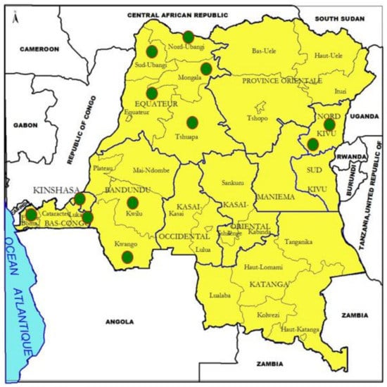 - Kitengie, L.J.B.; Mayele, N.B.E. La République Démocratique du Congo en Afrique et Dans le Monde; Imprimeries MEDI-ASPAUL: Kinshasa, Congo, 2013. [Google Scholar]