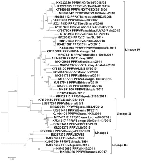 - Dundon, W.G.; Diallo, A.; Cattoli, G. Peste des petits ruminants in Africa: A review of currently available molecular epide-miological data. Arch. Virol. 2020, 165, 2147–2163. [Google Scholar] [CrossRef]