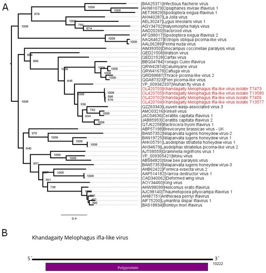 Phylogenetic relationships and genomic structure of the Khandagaity Melophagus ifla-like virus (KMIV). (A) Phylogenetic relationships of the KMIV. Analysis was performed using amino acid sequences of the polyprotein, with 1008 bootstrap replicates. Bootstrap support is shown at each node. Scale bar represents the number of amino acid substitutions per site. Viruses discovered in the current article are marked in red. Tree is midpoint rooted for the clarity of the figure only. (B) Scheme of the KMIV genome.