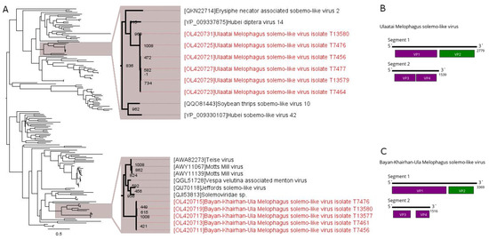 Phylogenetic relationships and genomic structure of the Ulaatai (UMSV) and Bayan-Khairhan-Ula Melophagus solemo-like viruses (BKUMSV). (A) Phylogenetic relationships within solemo-like viruses. Analysis was performed using amino acid sequences of the polymerase, with 1008 bootstrap replicates. Bootstrap support is shown at each node. Scale bar represents the number of amino acid substitutions per site. Viruses discovered in the current article are marked in red. Tree is midpoint rooted for the clarity of the figure only. (B) Scheme of the UMSV genome. (C) Scheme of the BKUMSV genome. RNA-dependent RNA polymerase is marked in green.