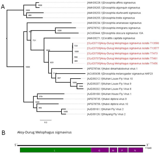 Phylogenetic relationships and genomic structure of the Aksy-Durug Melophagus sigmavirus (ADMSV). (A) Phylogenetic relationships within genus Sigmavirus. Analysis was performed using amino acid sequences of the polymerase, with 1008 bootstrap replicates. Bootstrap support is shown at each node. Scale bar represents the number of amino acid substitutions per site. Viruses discovered in the current article are marked in red. Tree is midpoint rooted for the clarity of the figure only. (B) Scheme of the ADMSV genome. RNA-dependent RNA polymerase is marked in green.