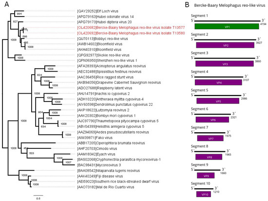 Phylogenetic relationships and genomic structure of the Bercke-Baary Melophagus reo-like virus (BBMRV). (A) Phylogenetic relationships of the BBMRV. Analysis was performed using amino acid sequences of the polymerase, with 1008 bootstrap replicates. Bootstrap support is shown at each node. Scale bar represents the number of amino acid substitutions per site. Viruses discovered in the current article are marked in red. Tree is midpoint rooted for the clarity of the figure only. (B) Scheme of the BBMRV genome. RNA-dependent RNA polymerase is marked in green.