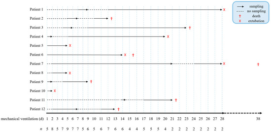 Sampling timeline of COVID-19 patients. Continuous sampling of serum and tracheal fluid began on the day that mechanical ventilation was required, and n refers to the number of patients from whom samples were received per day. Arrows indicate sampling, dotted lines represent sampling breaks, (X) marks patient extubation, and (†) the death of patients.