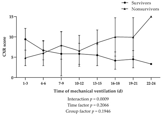 CXR analysis and scoring was used to determine disease severity in the lung tissue of our patient cohort. A general trend revealed a higher CXR score in nonsurvivors; however, no significant difference in CXR scores was observed between nonsurvivors and survivors over the time of mechanical ventilation (Figure 5).
