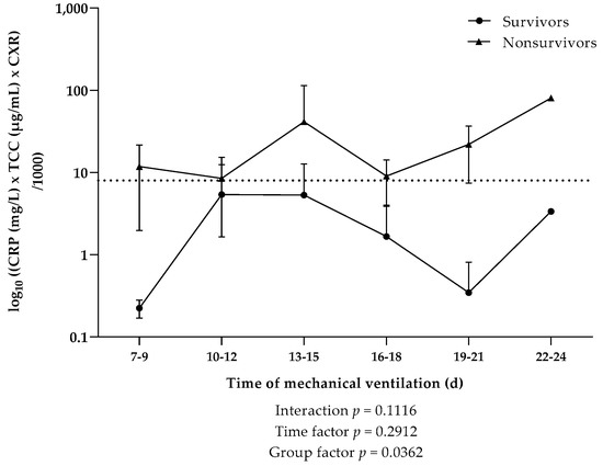 In order to pronouncedly indicate the interplay of the three specific parameters (CRP, TCC, and CXR score), which independently displayed overall elevated levels in nonsurvivors during the course of mechanical ventilation, a ratio of CRP × TCC × CXR kinetics was introduced (Figure 6). CXR scores in the two patient cohorts revealed a significant interaction in the first week of mechanical ventilation (Figure 5); therefore, values from days 1–6 were omitted from our analysis. Starting from the second week of mechanical ventilation, nonsurvivors showed a significantly higher CRP × TCC × CXR ratio compared to survivors. We further observed, in this specific cohort, that the mean values of CRP × TCC × CXR were consistently above 8 in nonsurvivors, while values in survivors did not exceed 5.4.