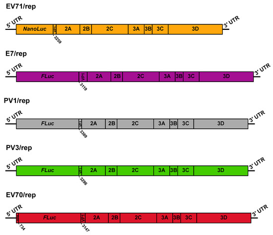 Schematic representation of donor replicon RNA templates. The genetic structure is shown for EV71/rep, E7/rep, PV1/rep, PV3/rep, and EV70/rep. Numbers below refer to the nucleotide number within VP1 at which the virus sequence restarts, relative to its position in the full-length genome. For EV70/rep, we also denoted the last nucleotide of the VP4 fragment present upstream of the luciferase gene.