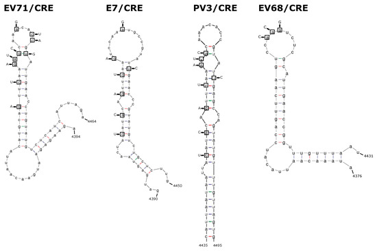 Representations of 2C-CRE stem-loop structures and mutations. The wild-type structure is shown for the 2C CRE of EV-A71, E7, PV3, and EV-D68. Nucleotides in boxes denote those mutated to knockout the CRE function, with replacement nucleotides shown with arrows.