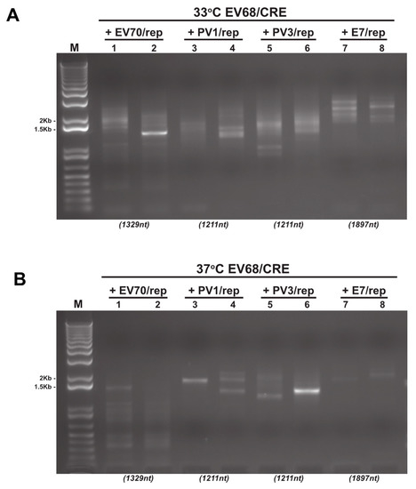 Reverse-transcription PCR analysis of CRE-REP assay samples. Example gel electrophoresis analysis of total RNA isolated and amplified by RT-PCR from CRE-REP assays. In this example, we show results from both 33 °C (A) and 37 °C (B) following co-transfection of the EV68/CRE acceptor template with either a species B, C, or D donor template. Lanes are numbered 1–8 for reference. Numbers in brackets below gel images are the expected sizes for a precise recombinant of each assay template pairing.