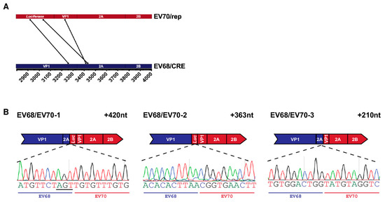 Total RNA was isolated from cells using a GeneJET RNA Purification Kit (ThermoFisher, Waltham, MA, USA) following 3 cycles of freeze–thawing and clarification by centrifugation at 10,000× g for 3 min. RNA was reverse transcribed at 42 °C using oligo dT, or EV68 specific primer (EV68(-)), and SuperScript II reverse transcriptase (Fisher Scientific, Loughborough, UK) as per manufacturers’ protocol. The region of recombination (VP1 to 2C) was amplified using virus-specific primers (Table S1) and Taq polymerase (NEB, Hitchin, UK) with an initial denaturing at 95 °C for 30 s, followed by 35 cycles of 95 °C for 30 s, 50 °C for 30 s and 68 °C for 1.5 min, and a final extension at 68 °C for 5 min.