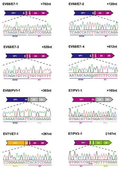 Following the analysis of the EV68/EV70 RNA population and the identification of recombinant genomes, we applied the same process to the inter-species CRE-REP assays. As with the EV68/EV70 assay, the inter-species RT-PCRs had yielded variable results. As previously described in Section 3.3, we, therefore, limited which assays would be subject to whole PCR cloning based on the observation of prominent gel electrophoresis bands at the approximate sizes for precise recombinant genomes. Five assays were selected for analysis across the spectrum of possible species crosses: EV71/E7 (species A + B), E7/PV1 (species B + C), E7/PV3 (species B + C), EV68/E7 (species D + B) and EV68/PV1 (species D + C), and a total of eight unique inter-species recombinant genomes were identified following Sanger sequencing (Figure 5; Table 2).