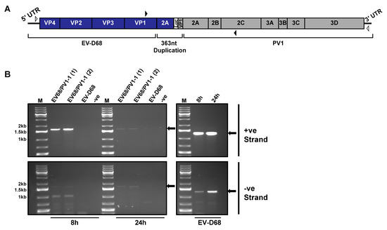 3.5. Inter-Species Recombinant EV68/PV1-1 Genome Generates Negative-Strand RNA