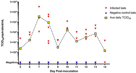 Marburg virus (MARV) RNA loads in oral swabs obtained from MARV experimentally infected bats (n = 10) and negative control bats (n = 5) shown by tissue culture infectious dose (TCID50) and day post-inoculation. For reference, the dashed line through the yellow squares indicates the daily average viral load for all 10 inoculated bats.