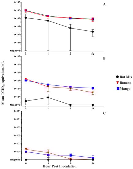 Reasoning that there was a high degree of potential variability between when MARV could have been deposited on fruit by infected bats and when fruit in the cage was sampled each morning (i.e., 0–24 h), a more rigorous virus viability experiment was performed in which different varieties of fruit were separately inoculated with high (1.00 × 105 TCID50), medium (1.00 × 103 TCID50), and low (1.00 × 101 TCID50) doses of rMARV-ZsG followed by sampling at 0, 1, 6, and 24 h. In this experiment, a total of 75/108 (69.4%) rMARV-ZsG-inoculated fruit samples were positive for MARV RNA (Table 1). Viral RNA was detected in at least one replicate of all MARV-inoculated fruit sample types at all time points through 24 HPI except for banana inoculated with a low virus dose at 24 HPI, bat mix inoculated with a medium virus dose at 6 and 24 HPI, and bat mix inoculated with a low virus dose at all time points. Mean viral RNA loads for high-dose fruit inoculations (Figure 2A) were as follows: banana ranged from 8.35 × 103 TCID50 eq/mL at 0 HPI to 7.22 × 102 TCID50 eq/mL at 24 HPI; mango ranged from 9.40 × 103 TCID50 eq/mL at 0 HPI to 8.48 × 102 TCID50 eq/mL at 24 HPI; bat mix ranged from 1.17 × 103 TCID50 eq/mL at 0 HPI to 2.27 × 101 TCID50 eq/mL at 24 HPI. Mean viral loads for medium-dose fruit inoculations (Figure 2B) were as follows: banana ranged from 1.61 × 102 TCID50 eq/mL at 0 HPI to 3.36 × 100 TCID50 eq/mL at 24 HPI; mango ranged from 1.03 × 102 TCID50 eq/mL at 0 HPI to 1.16 × 101 TCID50 eq/mL at 24 HPI; bat mix ranged from 0.30 × 100 TCID50 eq/mL at 0 HPI to undetectable at 24 HPI. Mean viral loads for low-dose fruit inoculations (Figure 2C) were as follows: banana ranged from 1.91 × 100 TCID50 eq/mL at 0 HPI to undetectable at 24 HPI; mango ranged from 0.98 ×100 TCID50 eq/mL at 0 HPI to 0.17 × 100 TCID50 eq/mL at 24 HPI. The RVFV internal extraction control was detected in 100% (36/36) of banana and mango samples but failed to be detected in 52.8% (19/36) of the bat mix samples (Table 1), a finding consistent with limited RVFV detections in the bat mix present in cages of MARV-infected bats described above.