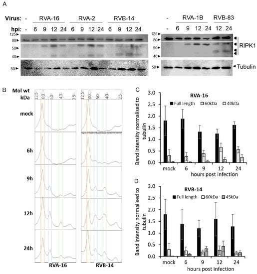 To determine whether the results that were seen for RVA-16 previously [5] were applicable to other RV strains, we investigated RIPK1 cleavage in infection. After infecting cells for various times within a single round of viral replication (6, 9, or 12 h), lysates were collected and processed for western blot analysis and staining with an antibody to the RIPK1 N-terminal. The 6 and 9 hpi timepoints from RVB-83 infected cells were excluded due to the low growth of the virus, and technical considerations. A ~60 kDa band was detected with the N-terminal RIPK1 antibody in all infection samples from 9 h of infection or more and was not detected in the uninfected control (Figure 1A). Interestingly, in some samples, more than one cleavage product was detected with the anti-RIPK1 antibody, with size differences observed between group A and B viruses. Thus, ~40 kDa product is observed in cells infected with RVA-16, -2, 1B, while a similar product appeared to be closer to ~45 kDa in cells infected with RVB-14, -83. Plotting the profiles of each lane, confirmed this difference, as shown in the representative profiles shown (Figure 1B). Densitometric image analysis for RIPK1 full-length and cleavage products showed a time dependent trend towards reduced full-length protein concomitant with increasing level of 60 kDa cleavage products from 9 hpi.; representative histograms for RVA-16 and RVB-14 are shown in Figure 1C,D respectively. In cells infected with RVA-16, there was a significant increase in 60 kDa product at 12 hpi relative to mock (p = 0.007), to 6 hpi (p = 0.003) and to 9 hpi (p = 0.04), indicative of time dependent increase. The increase in levels of the ~40 kDa band was not statistically significant. In contrast, in cells infected with RVB-14, the increase in levels of the 60 kDa band was not statistically significant while there was a very significant increase in the ~45 kDa band at all times post-infection, relative to mock (p < 0.0001).