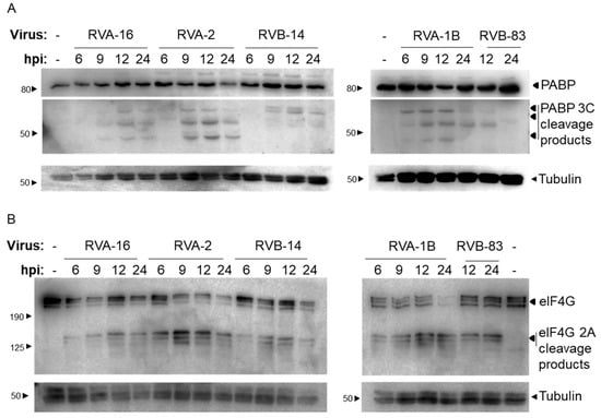 To confirm that the viral proteases were active at a time correlating with RIPK1 cleavage, two protease cleavage substrates were examined, namely eIF4G and PABP, being substrates of the 2A and 3C proteases, respectively. PABP cleavage products were detected in all infection samples at 9 hpi or later (Figure 2A) and in RVA-1B infected samples at 6 hpi or later. The cleavage profile of PABP differed between cells infected with RVs belonging to species A (RVA-16, RVA-2, RVA-1B) and those infected with RVs belonging to species B (RVB-14 and RVB-83), however, this was not explored further. Additionally, 2A protease activity was confirmed with eIF4G cleavage products detected in all infection samples (Figure 2B). Only the full-length protein (multiple bands, with a major band at ~220 kDa [17,18]) is observed in the non-infected (lanes labelled ‘-’) samples. On infection with RV, cleavage products are observed at ~125 kDa concomitant with reduced full-length protein relative to non-infected samples. We have shown previously [17] that cleavage of eIF4G by RVA-16 2A protease results in multiple cleavage products. The extent and efficacy of the cleavage varied between strains, with a significant reduction of the full-length protein observed at 24 hpi in RVA-2, RVB-14 and RVA-1B infected samples but not RVA-16 or RVB-83 infected samples.