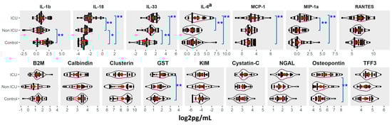 We detected increases in IL-18, IL-6, and MIP-1α in the COVID-19 ICU group versus controls and the non-ICU group (FDR < 0.05; Figure 1 and Table S1). We also detected an increase in IL-33 and MCP-1 in the COVID-19 ICU group over controls (FDR < 0.05; Figure 1 and Table S1). Cytokines IL-18 and IL-33 were higher and IL-1β was lower in COVID-19 non-ICU patients versus controls (FDR < 0.1 or < 0.05). We also detected elevated GST and osteopontin in the ICU group versus controls (FDR < 0.05, Figure 1). COVID-19 patients who had a genitourinary disorder had higher MCP-1 levels (FDR < 0.05; Figure S1). IL-1β levels were lower in COVID-19 patients with neurological disorders (FDR < 0.05; Figure S1). There were no significant associations with age or BMI.