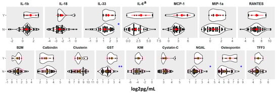 Cytokine and Renal toxicity marker levels by COVID-19 in-hospital death (Y vs. N). *: adjusted p-value (FDR) ≤ 0.1; **: adjusted p-value (FDR) ≤ 0.05. a: patients on cytokine inhibitor were excluded for analysis.