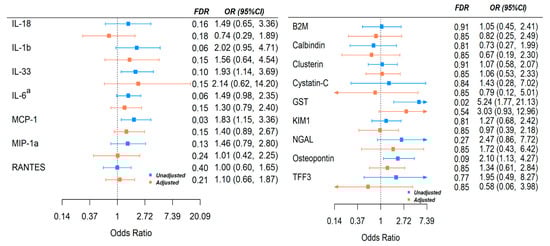 Additionally, we estimated the association between cytokine/renal toxicity markers with COVID-19 outcomes using the Firth logistic regression. Due to the small sample size and events, the ordinary logistic regression that is based on maximum likelihood estimation will yield biased estimates of coefficients. A penalized version such as Firth logistic regression is generally recommended for small-sample studies. Odds ratios of outcomes with a fold increase in marker levels were estimated. ORs were estimated on the basis of unadjusted and adjusted models. To correct for multiple testing issues, we adjusted p-values using the Benjamini–Hochberg approach for all above analyses. Adjusted p-values (FDR: false discovery rate) less than 0.1 or 0.05 are considered as suggestive cutoffs.