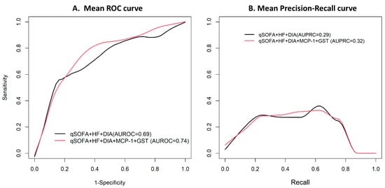We further considered using cytokine and renal injury markers to complement risk stratification. The ENAT model selected qSOFA score, history of heart failure, and dialysis as important clinical risk factors for in-hospital mortality. The area under the ROC (AUROC) was 0.69 (95% CI: 0.47–0.91; Figure 4). In addition to clinical factors, MCP-1 and GST were independently predictive of patient in-hospital mortality; the AUROC of the secondary model was 0.74 (95% CI: 0.56–0.92). It was significantly improved, and the p-value was found to be 0.038, obtained by parametric bootstrap. Precision-recall curve was also higher when MCP-1 and GST were included compared to a clinical risk factor-only model (0.32 vs. 0.29; p-value = 0.006).