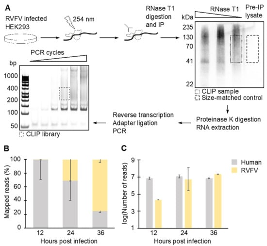 Approximately 107 MP-12-infected HEK293 cells (MOI = 0.1) were collected at various time points as follows; cells were washed twice with cold PBS, UV-crosslinked for 0.4 J/cm2 then 0.2 J/cm2, scraped, and pelleted. The pellets were flash frozen in liquid nitrogen and stored at −80 °C until use.