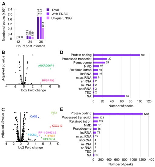 Peak calling analysis of reads aligned to human RNAs. To find regions on transcripts to which N was highly bound, peak calling analysis was conducted. (A) Number of peaks with Ensembl gene ID (ENSG). (B,C) Crossover analysis between CLIP-seq (this study) and transcriptomics of HEK293 cells infected with MP-12 [3]. CLIP-seq peaks were identified on transcripts that are neither up- or downregulated, with the following exceptions. ANKRE26P1 and RPSAP56 at 24 hpi (B) and IFIT2, CXCL10, OAS3, IFNB1, RP11-29H23.5, RPL24P4, and FSCN3 at 36 hpi (C). (D,E) Transcript biotypes of each peak found at 24 hpi (D) and 36 hpi (E). NMD = nonsense mediated decay. lncRNA = long noncoding RNA. miscRNA = miscellaneous RNA that includes ribosomal RNA and vault RNA. snRNA = small nuclear RNA. miRNA = microRNA. snoRNA = small nucleolar RNA. TEC = to be experimentally confirmed. ESTs (expressed sequencing tags). NA = not applicable (no transcript biotype assigned to the peak).