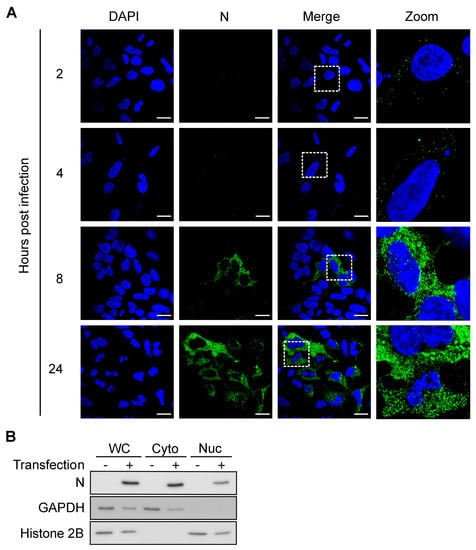N localizes to cytoplasm and nucleus after 8 hpi. (A) z-slice images from confocal microcopy analysis. MP-12-infected HEK293 cells were fixed at indicated time points and stained with anti-N antibody. Scale bars = 10 μm. (B) Western blot. HEK293 cells were transfected with a recombinant FLAG-N expression plasmid and fractionated into the cytoplasmic (Cyto) and the nuclear (Nuc) fractions. WC = whole cell. GAPDH = cytoplasmic marker. Histone 2B = nuclear marker.