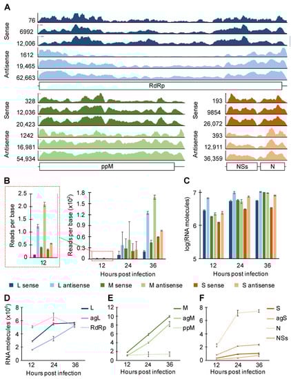 CLIP-seq read coverage on RVFV MP-12 sense/antisense segment and quantitation of intracellular viral RNAs. (A) Read coverages on RVFV RNAs are visualized. From top to bottom, 12, 24, and 36 hpi. The scales of the y-axes are defined by the height of the tallest peak at each time point. ppM = polyprotein M. (B) Statistics of reads-per-base CLIP-seq coverage. (C–F) Stranded RT-qPCR quantification of intracellular RNAs harvested from HEK293 cells infected with RVFV (MP-12) at MOI of 0.1. Means and SEMs of n = 2 biological replicates are plotted. L = L genome. agL = L antigenome. M = M genome. agM = M antigenome. S = S genome. agS = S antigenome. RdRp, ppM, N, and NSs signify coding transcripts for these proteins.