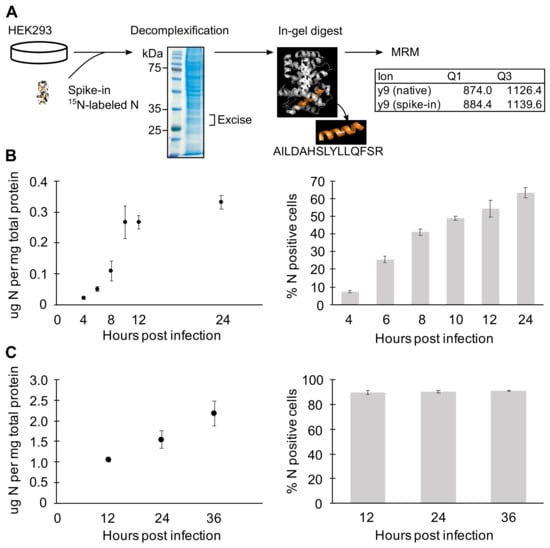 Quantitation of N protein expression by MRM-MS. (A) MRM-MS sample preparation workflow. (B,C) Quantitation of N protein expression by MRM-MS (left panels), and the flow cytometry analysis of N-expressing cells in corresponding samples (right panels). HEK293 cells were infected with MP-12 at MOI = 1 to characterize N levels arising from single infections (B) and later time points with MOI = 2 to observe effect of multiple/collective infection (C). Means and SEMs of n = 2 or 3 biological replicates are plotted.
