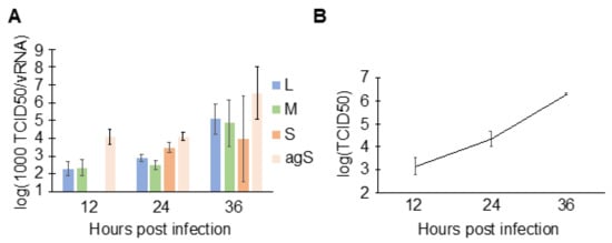 To understand the consequence of N binding to host RNAs at early time points (Figure 1B), the specific infectivity of viral particles with respect to each genomic segment was characterized. First, HEK293 cells were infected with RVFV, and the supernatant containing viral particles was harvested at indicated time points. The supernatant was used to extract viral RNA for RT-qPCR, as well as to determine the end-point titration (median tissue culture infectious dose; TCID50). By taking the ratio of the end-point titration to vRNA, the number of fully infectious particles per vRNA molecules (TCID50/vRNA) can be estimated. Growth of RVFV MP-12 on HEK293 cells has previously been characterized [48]. In addition to the three viral genomic segments, the number of antigenomic S (agS) segments was also quantitated since a previous report showed that this RNA is also packaged [12]. At 12 hpi, principally the L, M, and agS were packaged (Figure 6). The S segment concentration fell below the quantification limit at 12 hpi, which is consistent with the low intracellular concentration estimated at the same time point (Figure 4F). Then, at 36 hpi, the specific infectivity increased by 50- (M segment) to 260-fold (L segment) compared to those at 12 hpi. The increased specific infectivity at 36 hpi suggests that a greater proportion of fully infectious and fewer incomplete particles were present in the cell culture media, demonstrating increased packaging efficiency. RVFV-infected cells are known to release vRNAs in exosomes [49,50], and such vRNAs may contribute to the overestimation of vRNAs in the RT-qPCR assay. Thus, we immunoprecipitated viral particles in the media of infected cells using anti-Gn and anti-Gc antibodies and compared the quantities of vRNAs that are enveloped (with membrane expressing Gn/Gc) and unenveloped (free RNP complexes and exosomes). At 14 hpi, approximately 90% of the L genomic segment in the supernatant was packaged within viral particles (unpublished work), indicating that the amount of vRNAs released in exosomes and as free RNPs was relatively minor. Taken together, more infectious viral particles were produced later in infection, which correlates with the N–vRNA interactions observed in RVFV-infected cells (Figure 1B).
