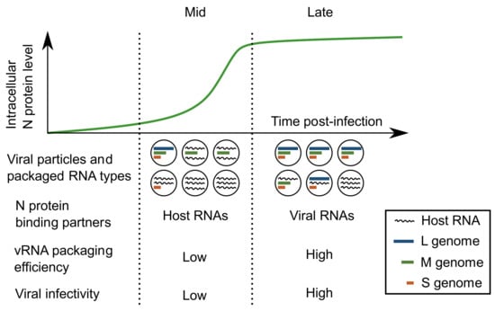 Formation of infectious and noninfectious viral particles. During the middle stage of infection (Mid), when N protein expression is actively increasing, the viral particles released include more host RNAs than vRNAs, resulting in low specific infectivity. At later stages of infection (Late), when N protein expression is stabilized and viral RNAs are at their peak abundance, the viral particles released include more vRNAs and have higher specific infectivity.