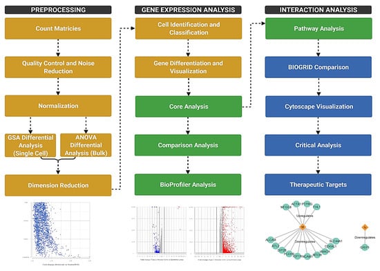 The single-cell and bulk RNA sequencing meta data sets were obtained from the National Center for Biotechnology Information’s Gene Expression Omnibus (GEO) (Table 1). Sources for samples include both autopsy samples taken from deceased patients and those from living patients with various levels of infection severity. These samples were taken from organs such as the heart, kidney, liver, and lung, as well as nasopharyngeal swabs. We used Partek Flow (Partek Inc., Chesterfield, MO, USA), a next generation sequencing software, for processing and filtering. The overall workflow of the study consisted of the pre-processing of count matrices, gene differentiation analysis, and interaction analysis (Figure 1). The significance of differentially expressed genes was determined based on fold change (−2 to 2) and p-value (0.05), where higher fold change indicated a more strongly down- or upregulated gene with possibly significant implications in host physiology (Supplementary Tables S1–S4).
