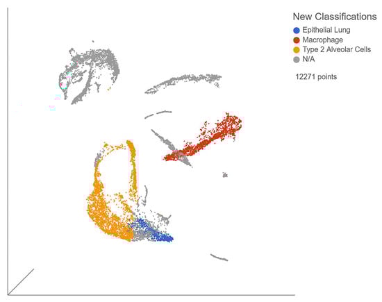 UMAP of blue points represent general lung epithelia, red points are AT2 cells, and yellow points are macrophages. Gray points represent unclassified cells. Generated in Partek Flow.