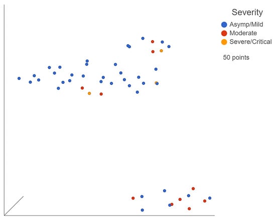 The most highly downregulated genes in moderate patients when compared to mild were MTRNR2L1, UNC79, ARL10, COL4A6, and TP63 (Supplementary Figure S6a). MTRNR2L1 is a protein associated with muscle disease. UNC79 encodes a subunit of a calcium channel. COL4A6 is a type of collagen IV while TP63 is a member of the p53 family involved with miRNAs in cancer. GTP binding promoter ARL10 was downregulated in this comparison, indicating that this gene is upregulated in mild and severe patients but not in moderate ones. A larger sample size would be required to determine if this finding is meaningful. The most upregulated genes were H2BC15, LRRC26, ATP12A, HES4, and DDX3Y (Supplementary Figure S6b). H2BC15 is a histone. LRRC26 is a protein associated with BK alpha voltage and calcium-activated potassium channels, and ATP12A is an ATPase associated with potassium absorption. Disturbances in the body’s natural potassium homeostasis can result in several different complications. Both hypokalemia and hyperkalemia can lead to arrhythmia and even fatal heart attack. Notably, the upregulated gene HES4—a transcription factor associated with phosphoinositide 3-kinase (PI3K)/protein kinase B (AKT) signaling—indicates an increase in PI3K signaling, a pathway that is taken advantage of by the virus for entry and development of the immune response [17].