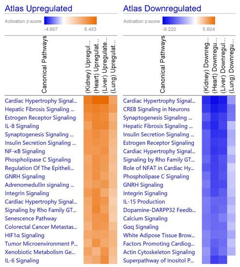 Heatmap comparing the top 20 pathways in organs. Orange indicates upregulation while blue indicates downregulation, and a stronger color indicates a stronger effect. Gray indicates that the software was unable to predict the effect. The repeated pathways are due to individually down- or upregulated steps within the pathway. Generated in IPA from gene lists.