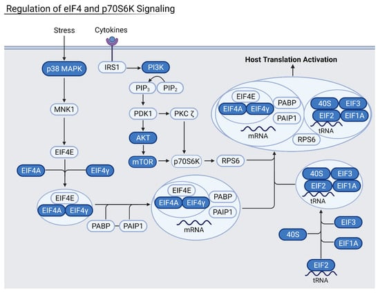 Summary of the eIF4 pathway where blue proteins are downregulated. Samples from severely infected heart, kidney, and liver shared these common downregulated factors. The eIF4 and eIF2 pathways work together to activate and enhance host translation, and their inhibition leads to increased viral translation. Generated in Biorender.
