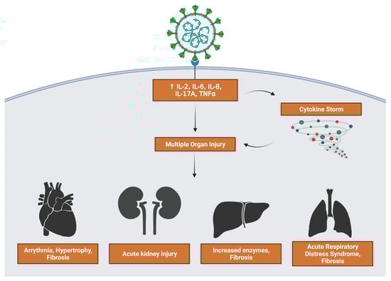 Consequences of viral stimulation of inflammatory factors. Upregulation of cytokines feeds directly into multiple organ injury as well as activating a cytokine storm that further contributes to injury. Generated in Biorender.