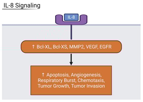 Diagram showing IL-8 downstream effects on organs. Inflammatory IL-8 upregulates host factors that contribute to cell death, angiogenesis, respiratory burst, and more. Generated in Biorender.